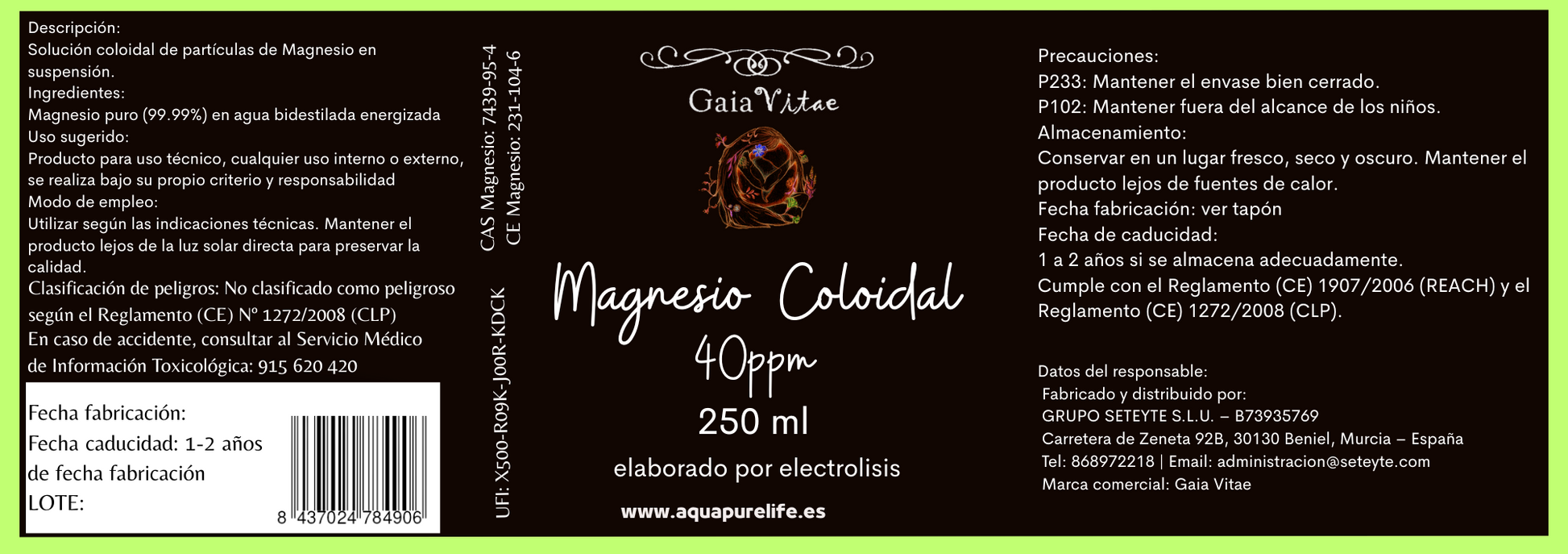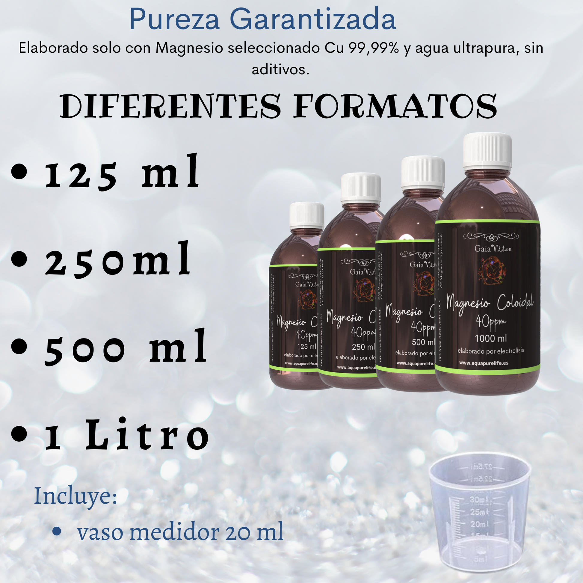 Magnésium Colloïdal 40 PPM | Formule technique de haute pureté élaborée à l'aide d' une électrolyse avancée , avec 99,99 % de magnésium pur en suspension dans de l'eau bidistillée de première qualité .
